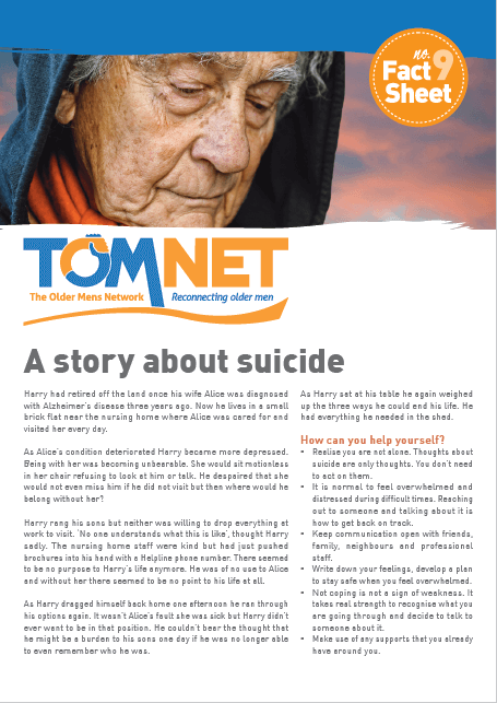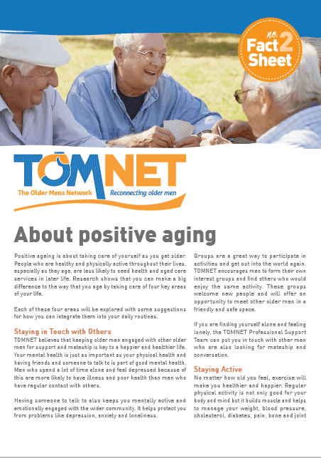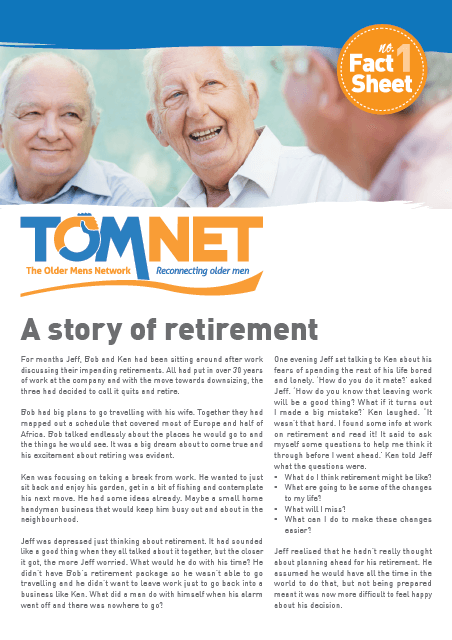 TOMNET provides older men with opportunities for mateship, the chance to re-connect with the community and cope positively with life after loss. TOMNET is a non-religious and non-party political organisation, and all men are considered equal.